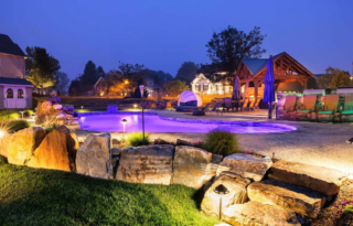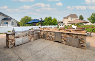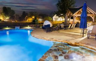 The outdoor kitchen is large enough to seat 10 comfortably and is equipped with both gas and charcoal grills, allowing for versatile cooking options for any size event. A custom stone fireplace and pavilion provide cover and warmth, comfortably seating 12 to 15 people. The fireplace combines the best of both worlds with a wood-burning option and a natural gas log lighter for a roaring fire in minutes.