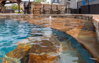 This remarkable project features a custom gunite swimming pool with Pocono flagstone coping, a sun shelf, a stone waterfall, and a dive rock. The sun shelf, benches, and steps are all finished with Pocono flagstone, while the pool perimeter is lined with Quarry Cut stone veneer, offering a unique alternative to traditional tile.