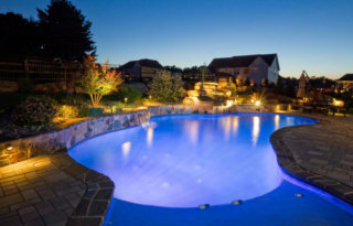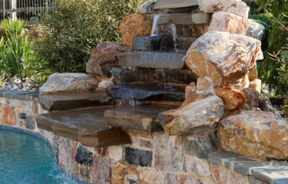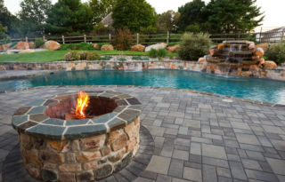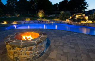 Evergreen Hardscaping successfully blasted and removed the granite, reclaiming the stone for use in several property features. The reclaimed granite was utilized to construct retaining walls and incorporated into a custom-built waterfall. The pool coping, sitting walls, and firepit were adorned with antique Pennsylvania flagstone, while Fenoff field stone was applied to all vertical surfaces.