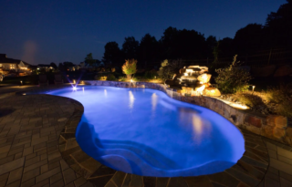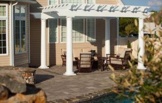 The patios were crafted with EP Henry Village Square paving stones, and the seating area was enhanced with a beautiful custom-built pergola. The entire pool surround and landscape were accented with CAST low voltage lighting, and the yard was enclosed with Bufftech vinyl fencing. Pennsylvania Antique slabs were strategically placed to navigate elevation changes in the yard.