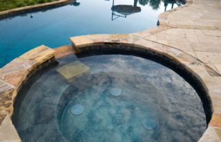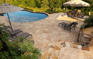 The pool walls and surround were constructed using Fenoff fieldstone and capped with Tennessee flagstone, while all patio surfaces were finished with Peruvian travertine. The project was completed with a Jerith aluminum fence and CAST low voltage lighting to enhance and showcase the entire area.